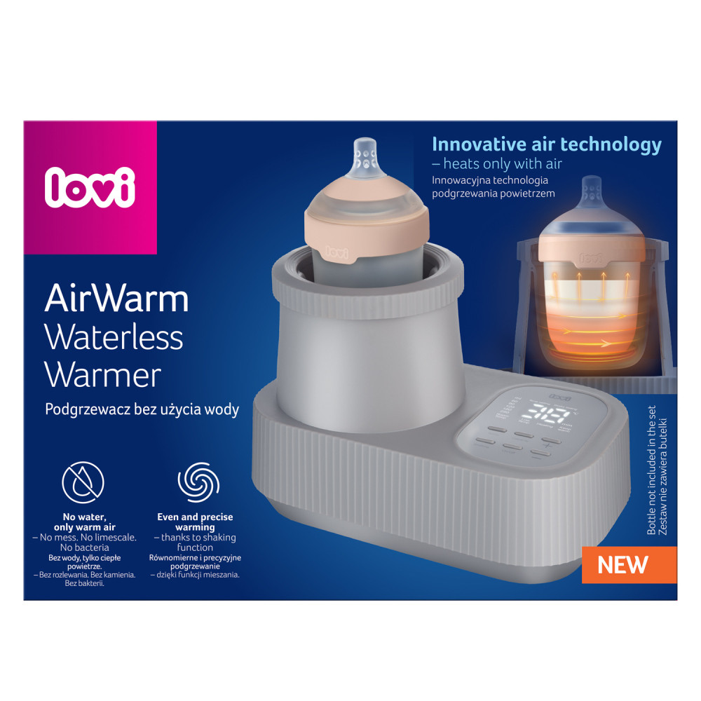 LOVI AirWarm: víz használata nélküli cumisüveg-melegítő innovatív meleg levegős technológiával. Egyenletes melegítés, pontos hőmérséklet 37–48 °C között, egyszerű karbantartás, és a víz akár 24 órán át melegen tartható.