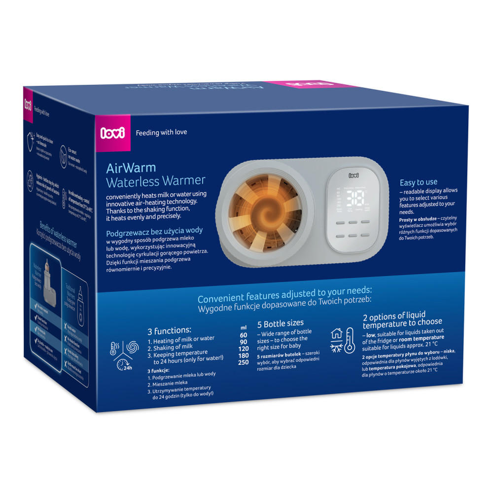 A LOVI AirWarm cumisüveg-melegítő innovatív meleg levegős technológiával működik, így nincs szükség vízre. A készülék könnyen tisztán tartható, nem keletkezik vízkő, és a cumisüvegek szárazak maradnak, csökkentve a baktériumok elszaporodásának kockázatát.