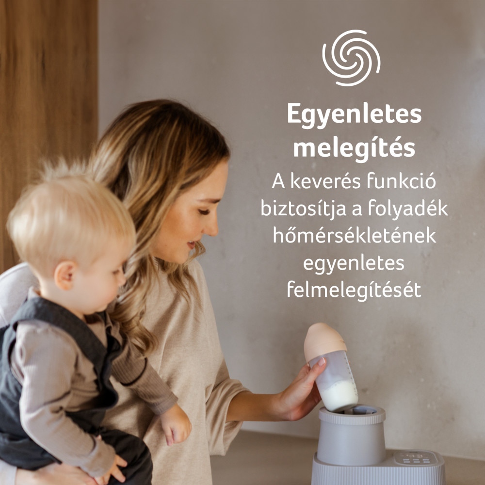 A beépített keverő funkció egyenletesen melegíti a tejet vagy vizet a 37–48 °C közötti beállított hőmérsékletre, minimalizálva a túlmelegedés kockázatát és biztosítva a gyermek biztonságát.
